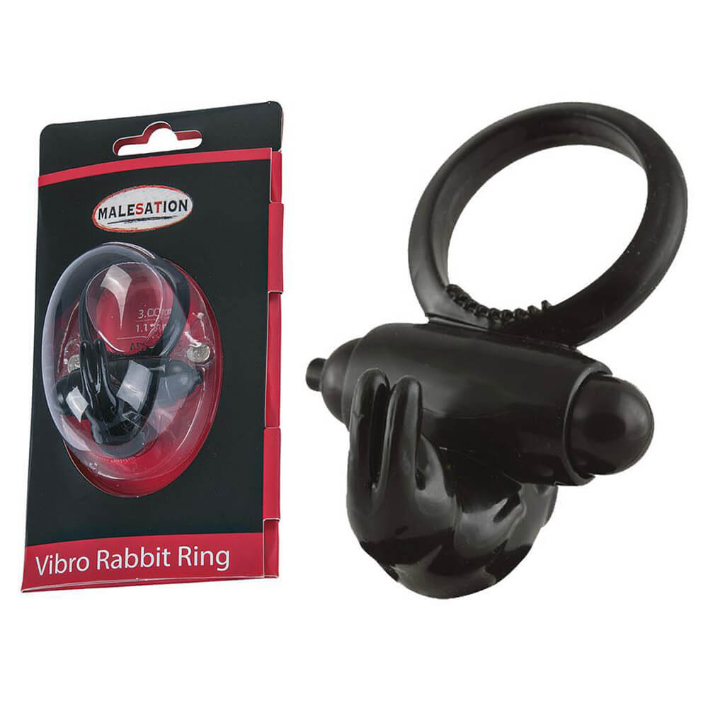 Vibrating ring with a rabbit-shaped clitoral stimulator. Material: ABS and TPE, incl. 4 minibatt. (LR41), inner. Comfortable and stretching cock ring.