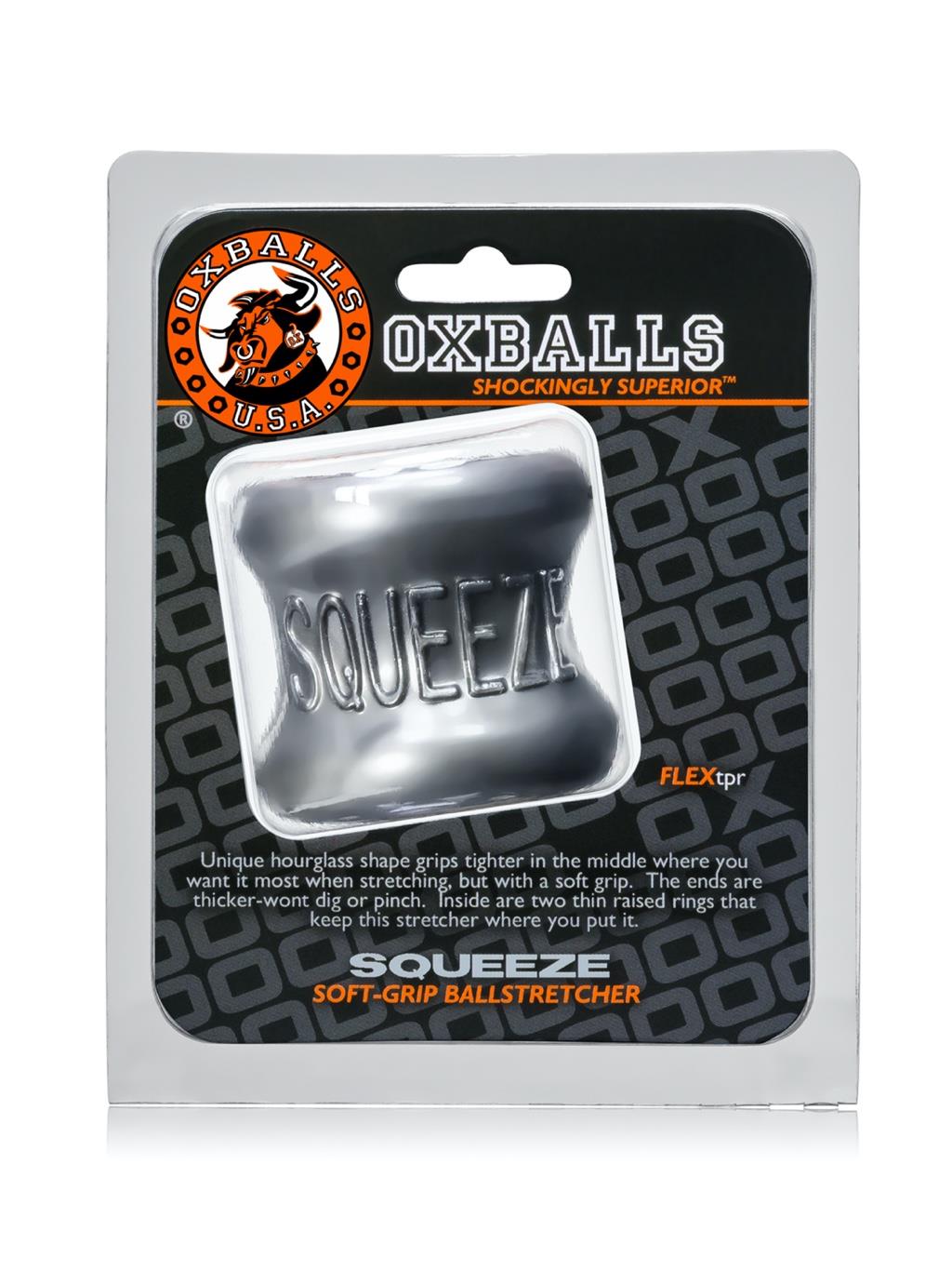 SQUEEZE is a thick, blubbery ballstretcher that is designed to comfortably stretch the scrotum. Made from Oxballs' signature FLEXtpr, it is super stretchy and soft, but firm enough to cling to the wearer like a second skin. Each end is topped with a padded ring that pushes the testicles down and stretches the scrotum away from the wearers body. The soft material and ergo-curved design make the SQUEEZE the ideal stretcher.