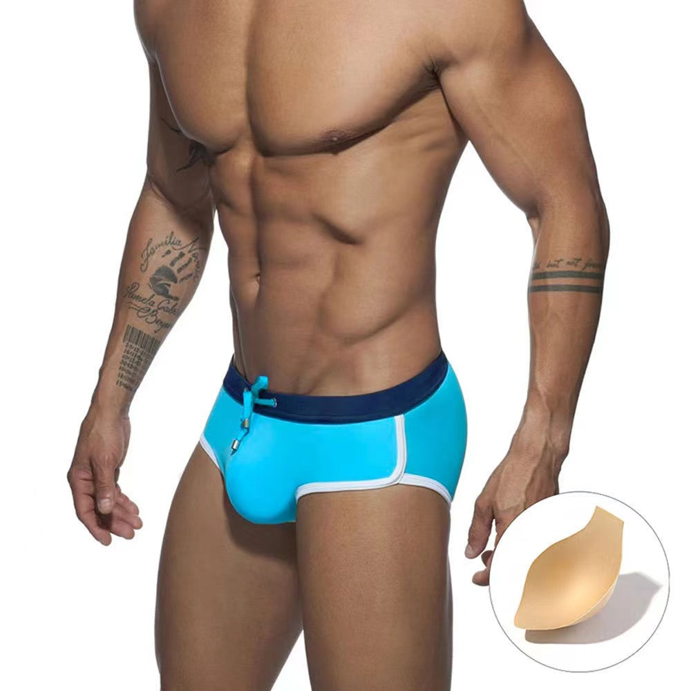 Body-defining fit contour pouch flatters physique. Color contrast microfiber waistband.