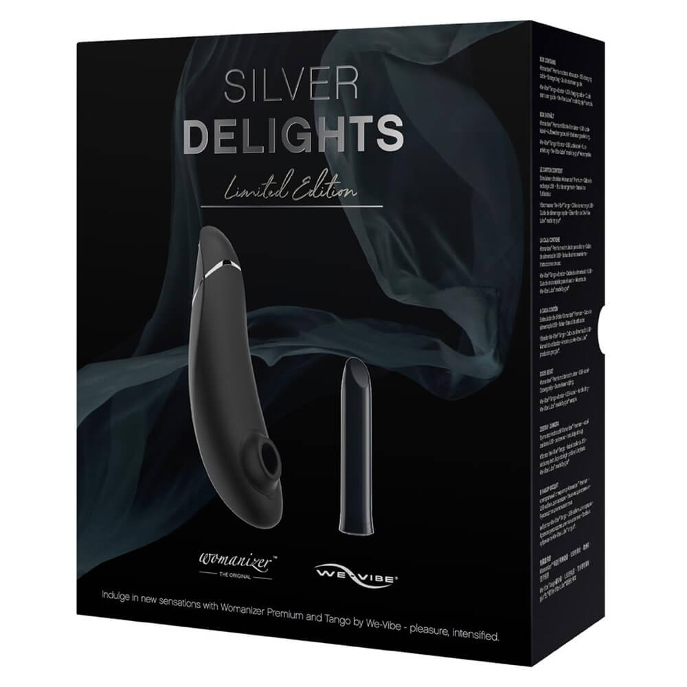 The Womanizer/We-Vibe Silver Delights Collection features a Womanizer Premium and Tango by We-Vibe in matte black with silver accents.